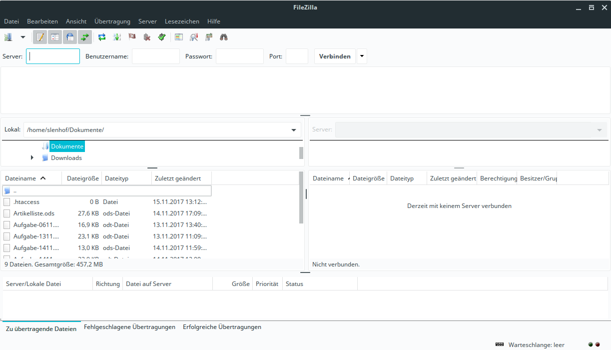 Links sehen Sie in FileZilla die Dateien und Ordner von Ihrem lokalen Rechner. Rechts werden die Daten Ihres Servers angezeigt, sobald Sie verbunden sind. Sie können nun Daten per Drag and Drop zwischen dem Server und Ihrem Rechner austauschen.