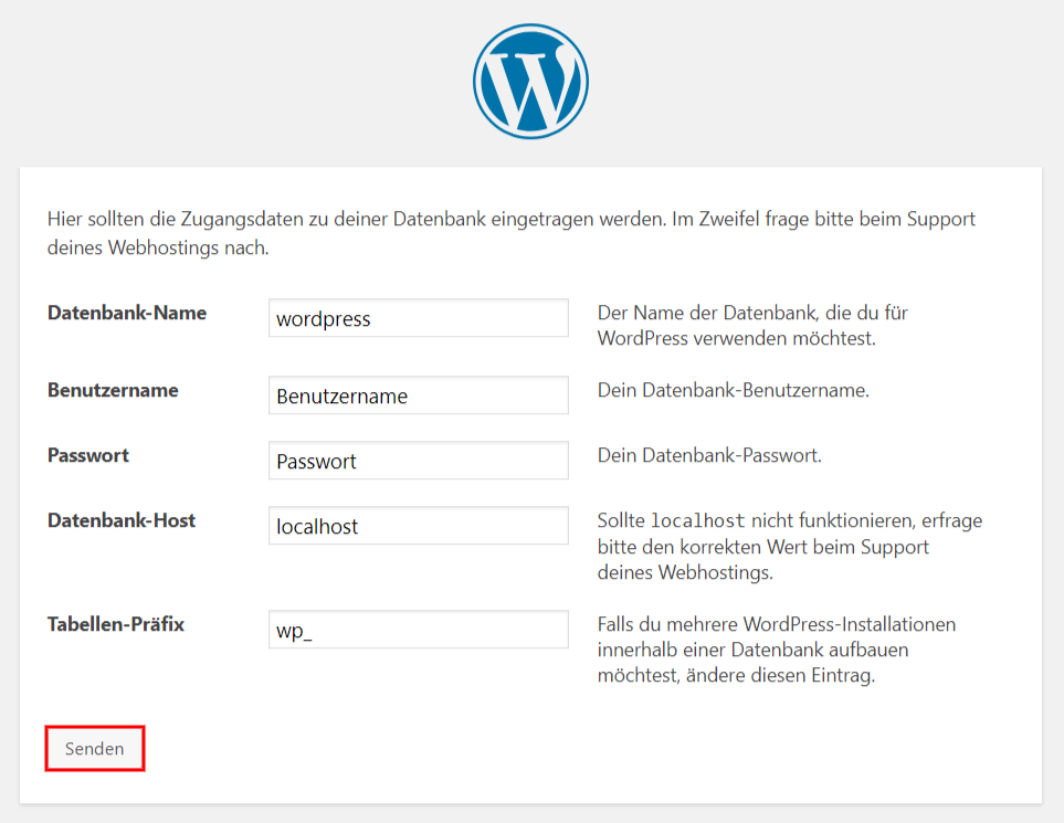 Geben Sie Ihre Zugangsdaten zu Ihrer Datenbank vollständig ein.