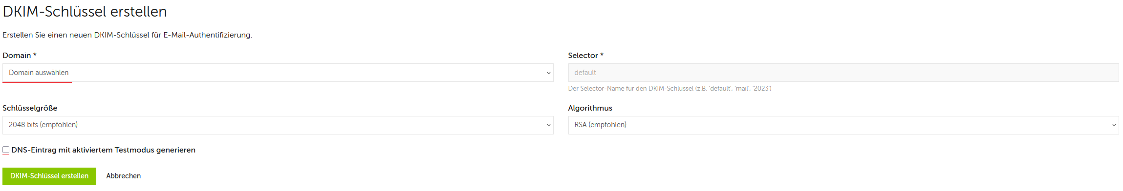Wählen Sie die Wunschdomain aus, für die ein DKIM-Schlüssel generiert werden soll: