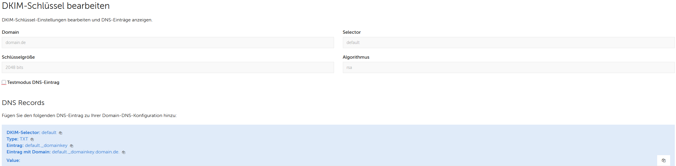 Nach der Generierung des Schlüssels, können Sie den DKIM-Schlüssel bei Bedarf bearbeiten.