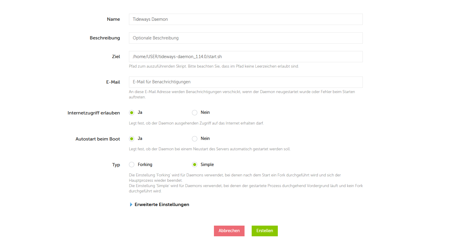 Unter dem Punkt "Erweiterte Einstellungen" sollte man dem Daemon noch etwas mehr RAM (z.B. 512 MB) geben.